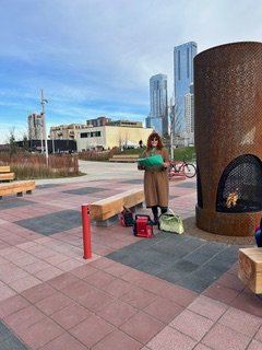 And now here we are, Edmonton, with a brand new urban park of our own, buil tentirely for everyone right from the start, where tired parking lots used to sit on their crumbling concrete floes. Isn’t it grand? To celebrate, I thought I’d read you some descriptions of those parks Imogene has found herself in in Paris, and Dublin and Florence and Prague. The first two cities are in the books Victor & Me in Paris, and Wexford Carole, which are both in print, andmavailable right over on that side of the park, in the beautiful Audreys Books. The Florence adventure will be out next fall, and the Prague mystery the year after that. So you’re getting a sneak peak of those.